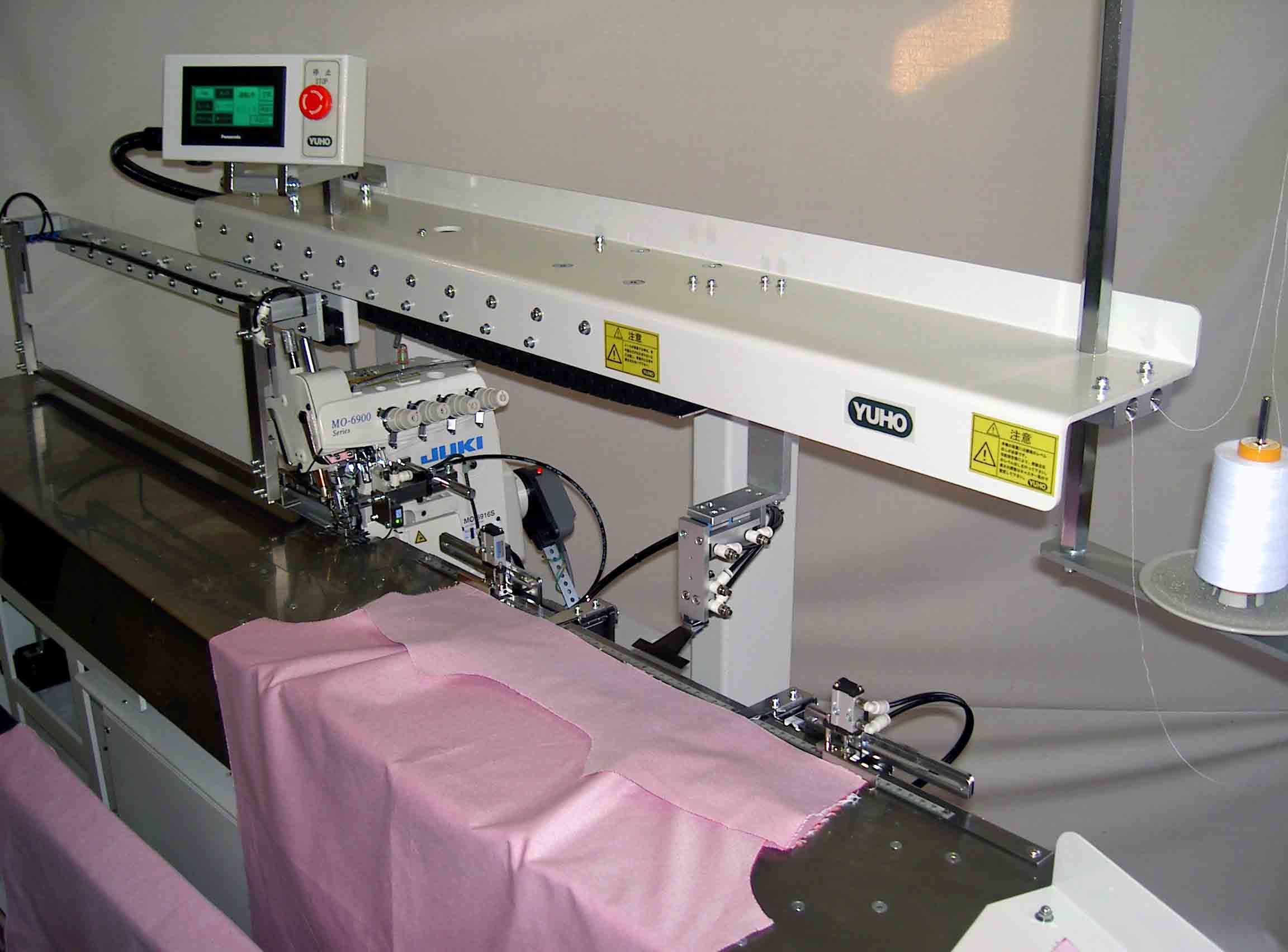 | 数々のこだわりの装置 | 素材のセットには、サイズに合わせ左右移動のできる素材保持装置とテーブルバキュームの吸引装置により正確で素早いセットが行えます。 又、素材の置台はヨーク地の置台と身頃の置台が操作性の良い場所に配置され、作業能率が一段と向上します。 ミシン糸の交換も手元に配置し、使い易さの追求が随所に生かされたYUHOならではの自動機です。 |