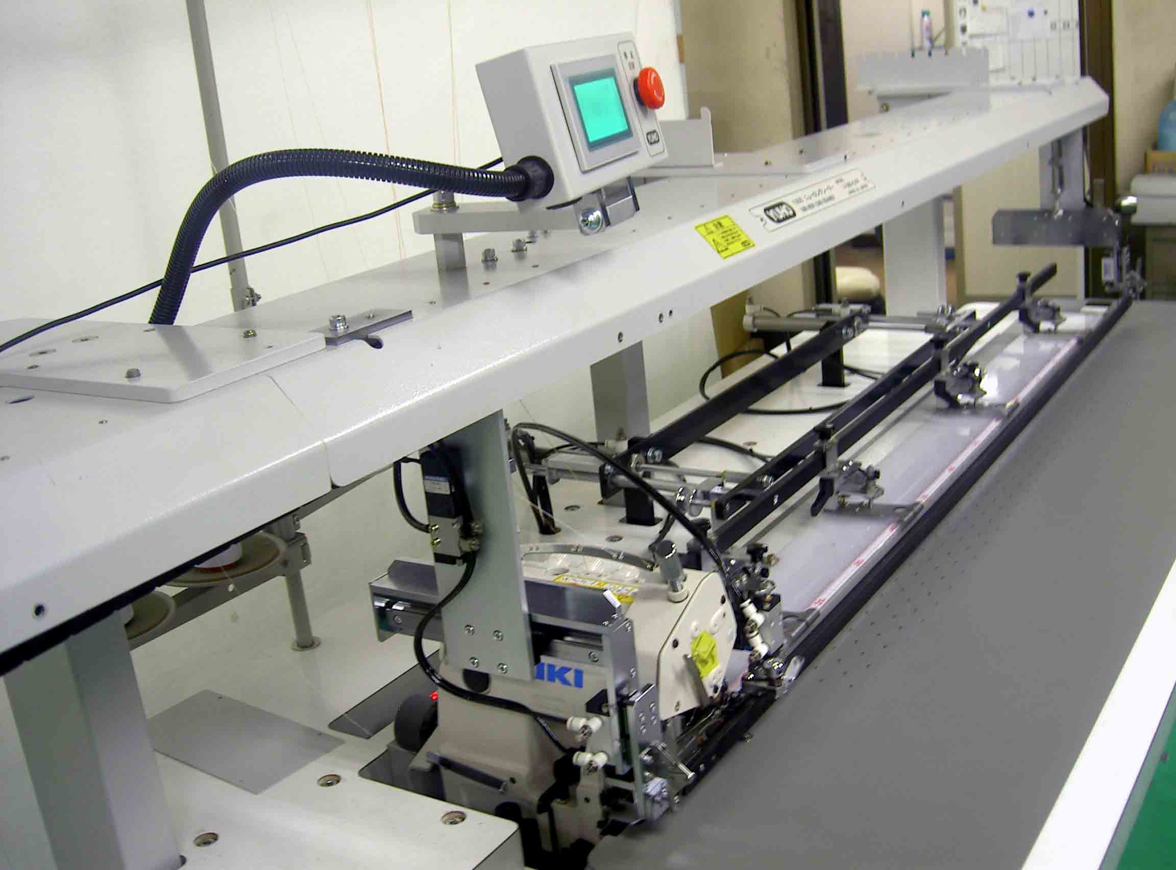 | 主な装置 | ★ ガイドレール強力パルスモーター送り ★ 液晶タッチパネル表示 ★ キーパー保持装置4組付き ★ 直線レールと定規セット1組 ★ テーブル吸引バキューム装置(ダンパー脱着式) ★ レール送りストローク可変式 ★ 針元ガイド押え装置 ★ 長尺縫い仕様 ★ さばき付きスタッカー装置 ★ エァ−ガン |