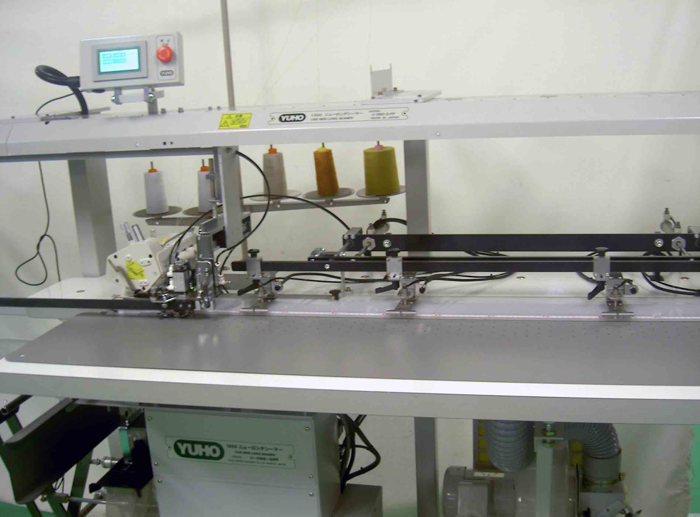 | 本格的インター&二重環ロングシーマーで高品質地縫い! | 本格的インター&二重環ロングシーマーは、縫い長さ最大1,300oまでの長距離地縫いが一気に縫え、ガイドに沿った美しい高品質な地縫いが行えます。 長年の経験と技術による、独自のガイドレール送り方式をベースに機械精度の向上、サイクルの短縮化など新技術を加え、ニットからジーンズ素材まで高品質の縫いを実現します。 さらに、柄合わせ、格子合わせ縫いにも素材全体をしっかり押さえて送るレール方式が、特にその威力を発揮します。 新素材、極端な異質素材の重ね縫いなど、多彩な素材への可縫性を備えています。 美しいシームラインは、ガイドレールに沿って縫われ、ユガミ、ヨタレのない完璧なデザインを再現します。 縫われた素材はスタッカーにより自動的に積み重ねられます。 |