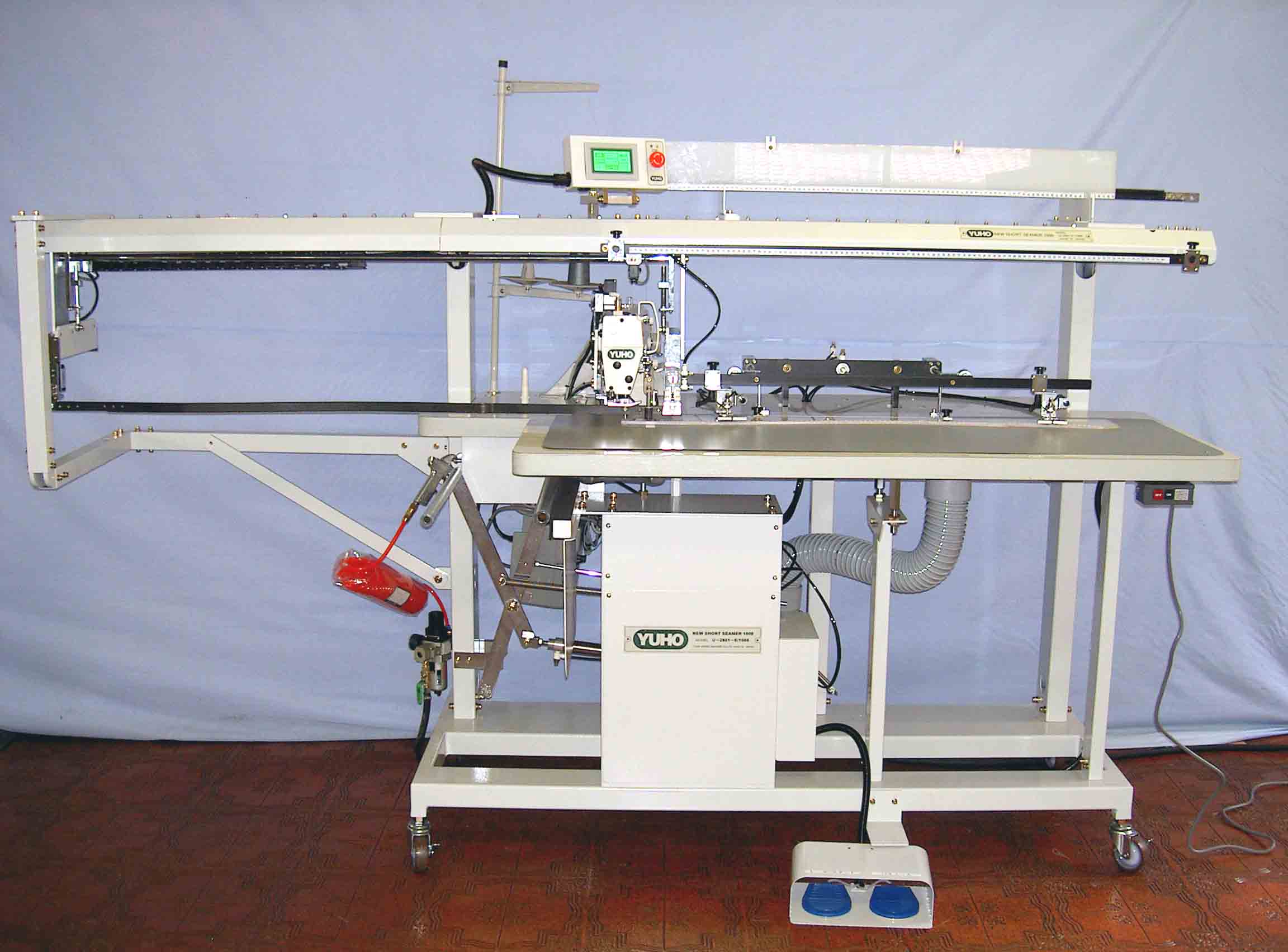 | ガイドレール送り方式とYUHO独自の下糸くり出し装置により完璧なシームラインを再現します。 | YUHOショートシーマーは、独自のガイドレール送り方式をベースに長年培われた技術を終結し、さらに磨いて一新しました。 曲線パターンに合せてヨコ方向1,050o、タテ方向140oのXY軌導方式により、左右前後を確実に送ります。 コンピューター制御による新機能を満載して縫いズレ、ユガミ、ヨタレのない完璧なシームラインを再現します。 ガイドレールの送りは戻り方向は全速で戻り、また縫い方向もわずかな無駄を無くすため、素材までの空送りを高速で送ります。 縫いの間は素材の条件にあわせボリューム一つで自由にスピードの設定が行えます。 また、ガイドレール方式では素材全体をしっかり押えて縫われるため、手を添える必要もありません。 布端は光電センサーが検知し、サイズの長短に関係なくスタート・ストップします。 特に針元ではガイドレールの浮きを無くすため、針元をしっかりと押さえ込む「針元ガイド押え」も装備され、ミシンの高速(最高4,000rpm)縫いを可能とし、レールに添った美しいシームラインを実現します。 |
