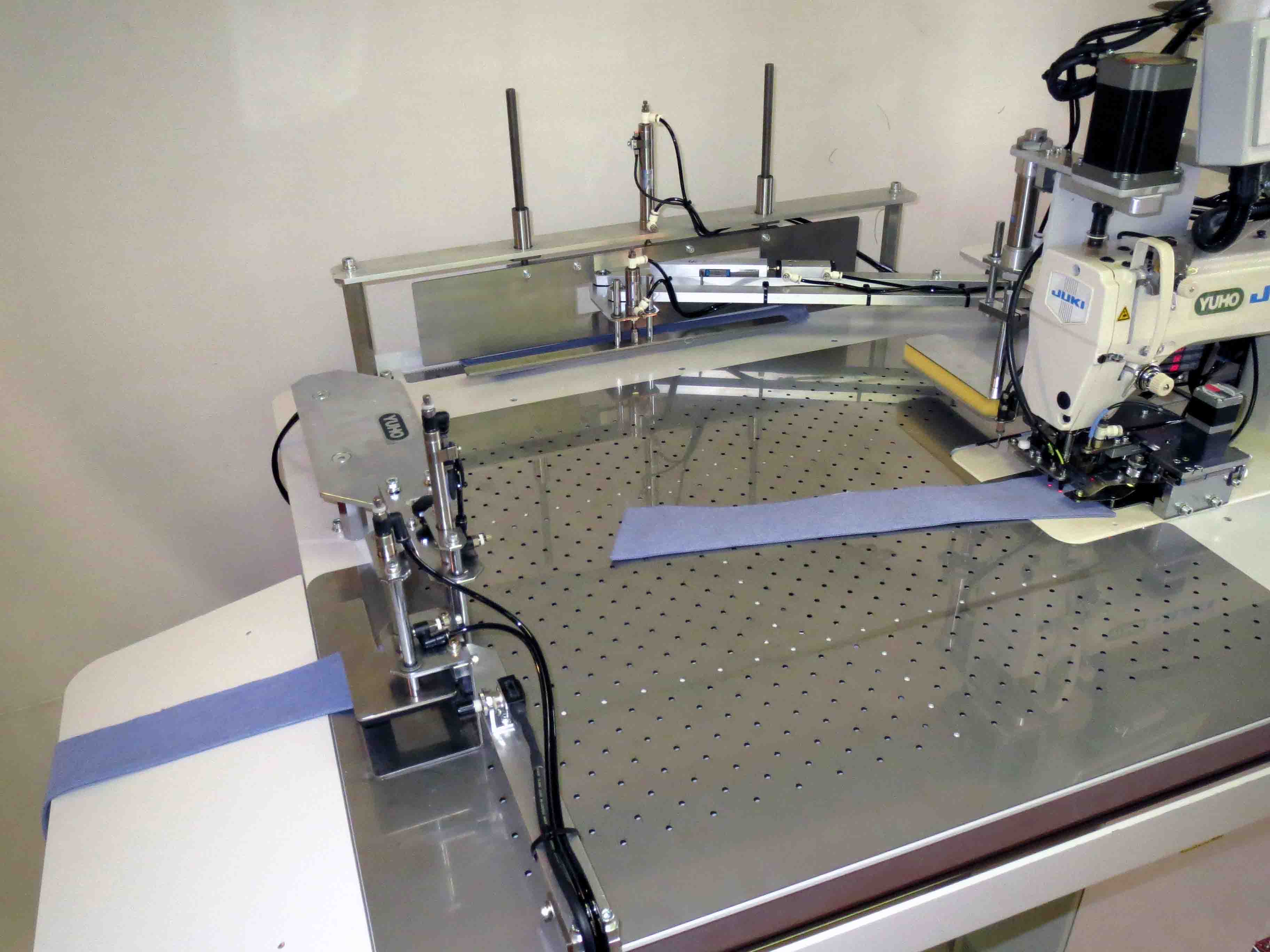 | 主な装置 | ★ フローティングエァーテーブル ★ 液晶タッチパネル採用 ★ セット位置決め保持装置 ★ 定規・停止位置自動設定装置 ★ 衿自動供給装置 ★ 布寄せエッジガイド ★ 送り・回転・寄席の各補助送りエァー ★ テーブルストッパーピン(2ヶ所) ★ コーナー半針縫い装置 ★ 光ファイバーセンサー(3ヶ) ★ パルスモーターによる素材回転装置 ★ スタッカー装置 ★ 糸切れ検知装置(T.B.D) ★ 減算カウンター ★ エァ−ガン |