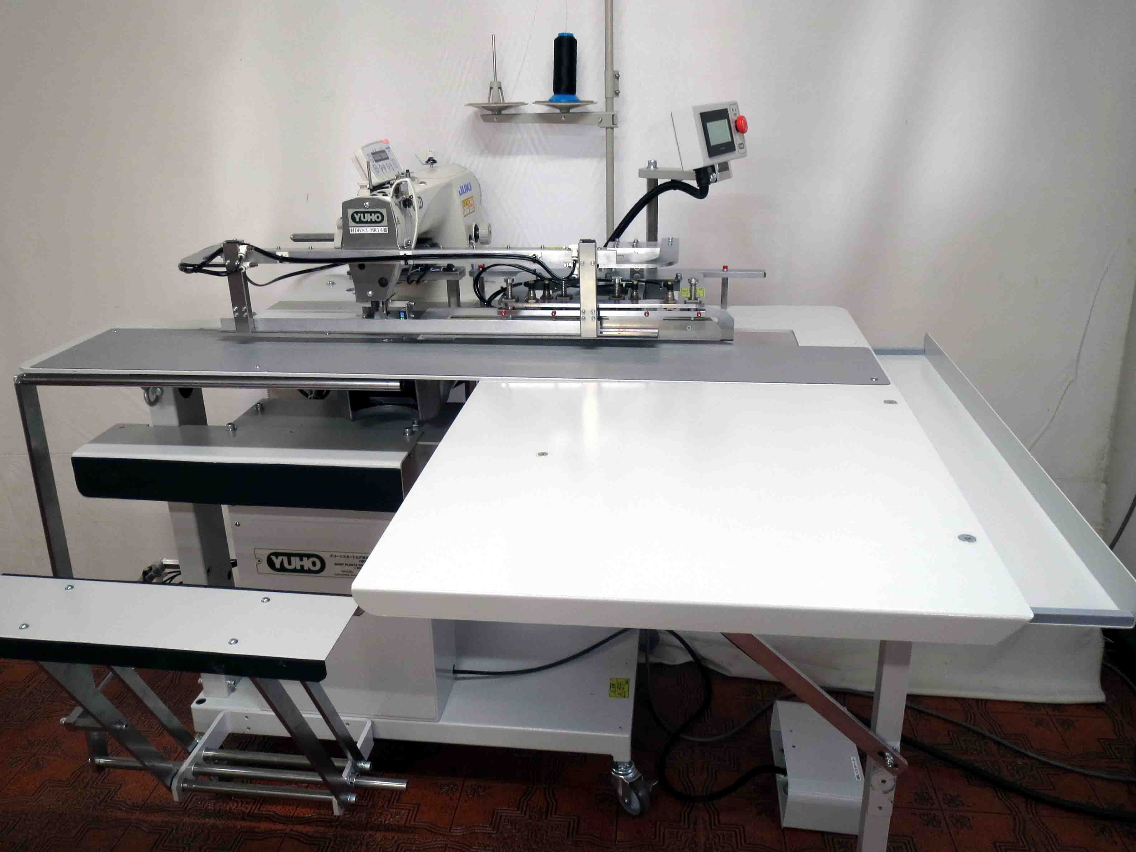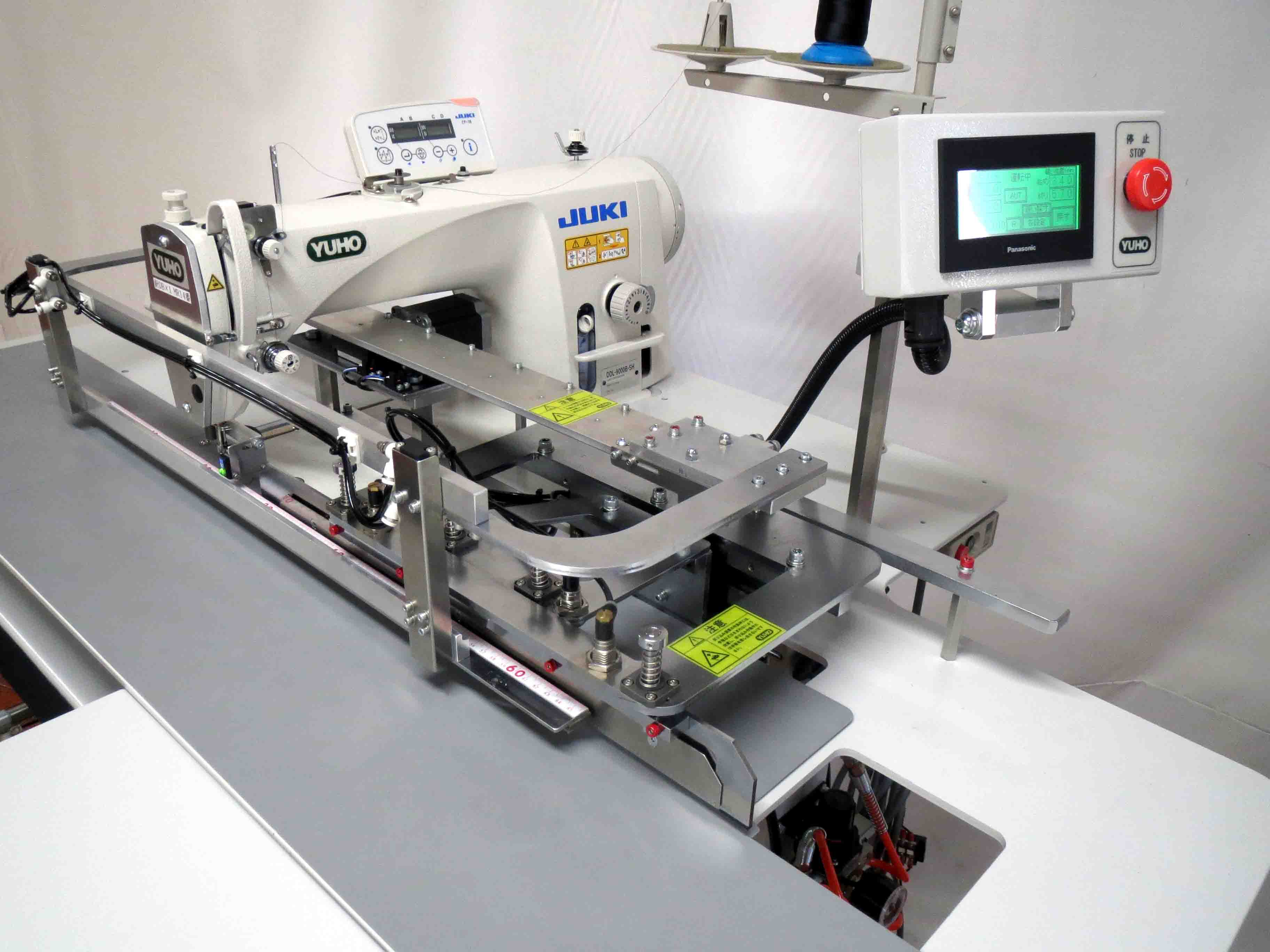 | 主な装置 | ★ 液晶タッチパネル表示 ★ ヒダ折込み装置 ★ レール送り装置 ★ さばき付きスタッカー装置 ★ 糸切れ検知装置(T.B.D.) ★ 積算・下糸残量カウンター ★ エァ−ガン |