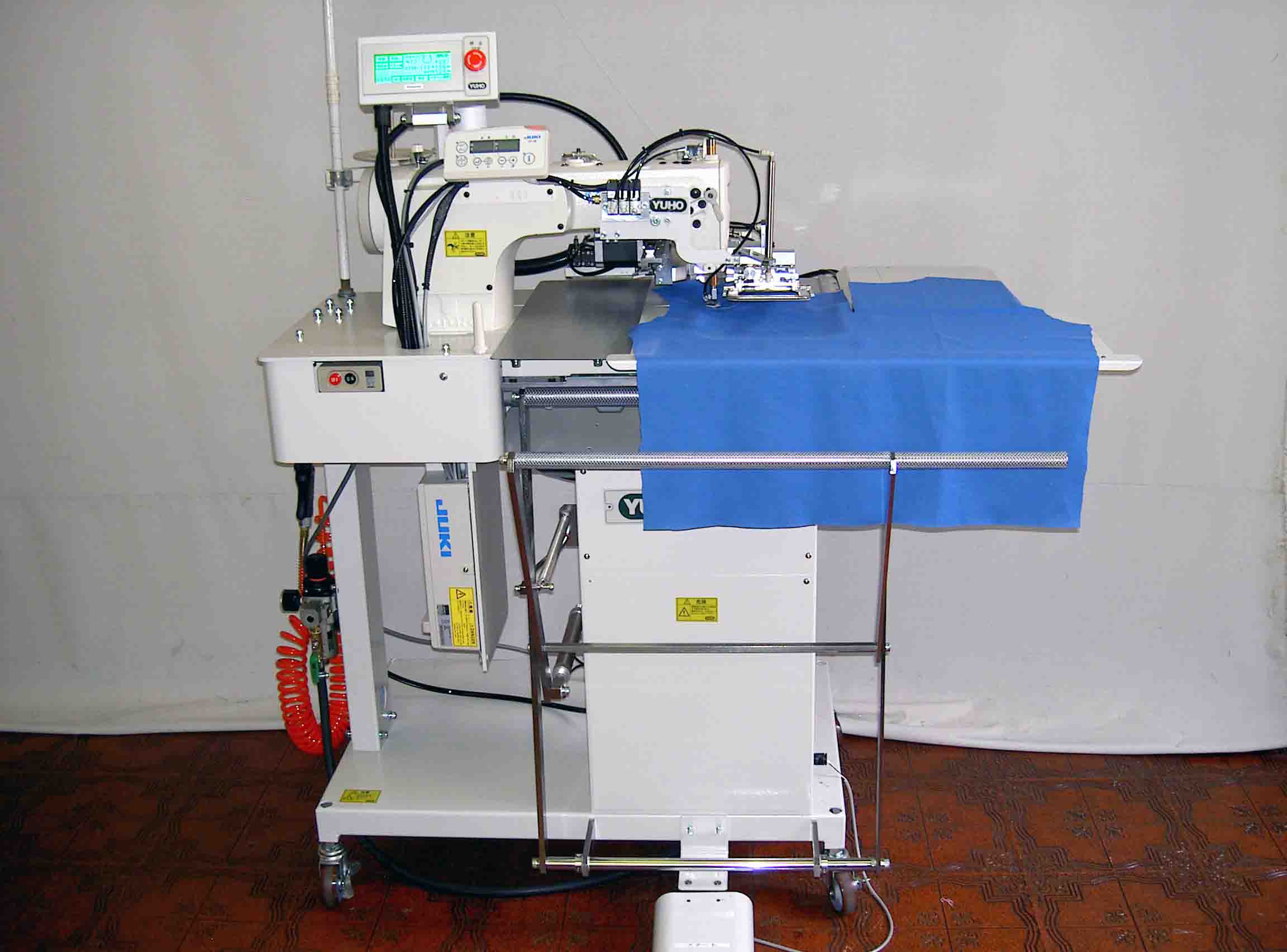| MAIN DEVICES | @@ "X/Y" stepping motor @@Standard pattern gauge & software @@Needle foot presser @@LCD touch panel display @@Stacker @@Thread Breakage Detector ( T.B.D ) @@Bobbin thread counter @@Air gun @@Caster with 2-brakes |